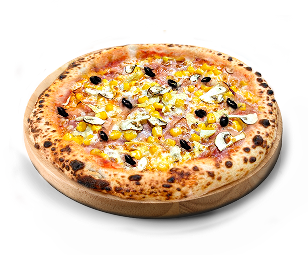 sos de rosii, mozzarella, prosciutto cotto, porumb, ciuperci, masline